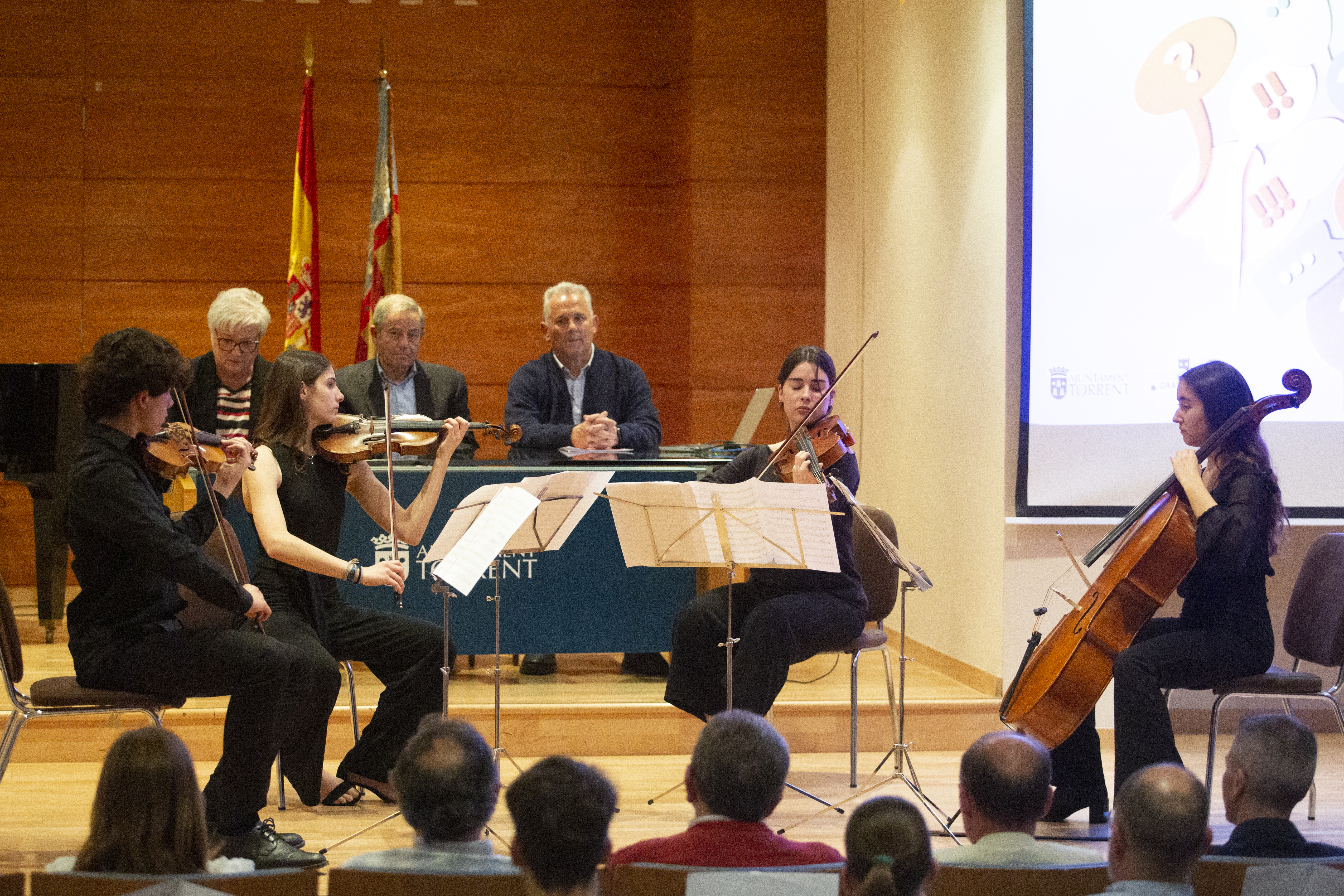 Amb un èxit d’assistència sense precedents, a continuació d’un parlament introductori en què es va posar en valor la importància dels premis, la literatura en valencià i la necessitat de fomentar la nostra llengua, el quartet de corda del Conservatori Superior de Torrent va interpretar dos obres de gran bellesa.